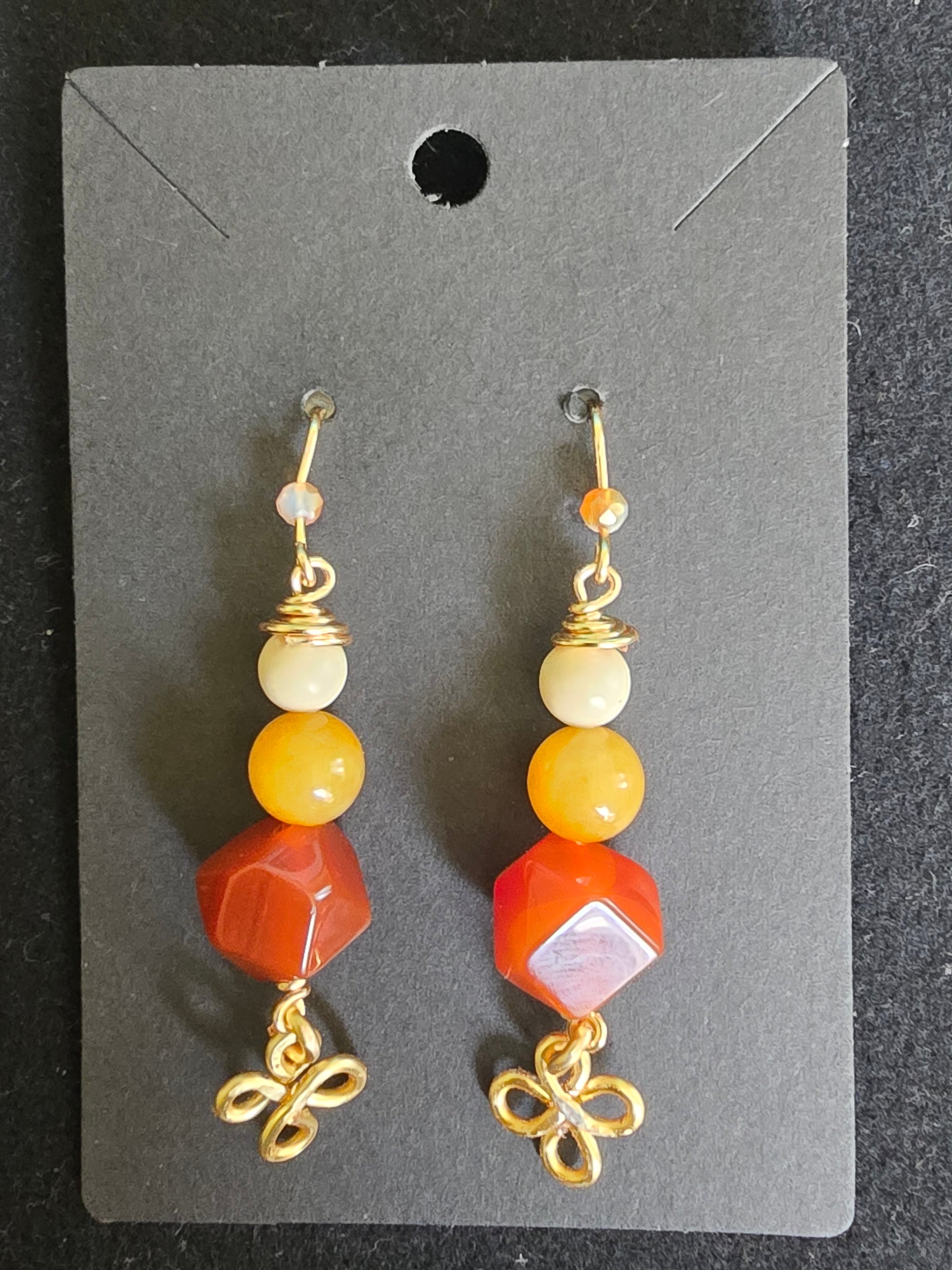 Materials: Genuine carnelian, honey jade, ivory agate; gold-toned wire & Celtic knot charm